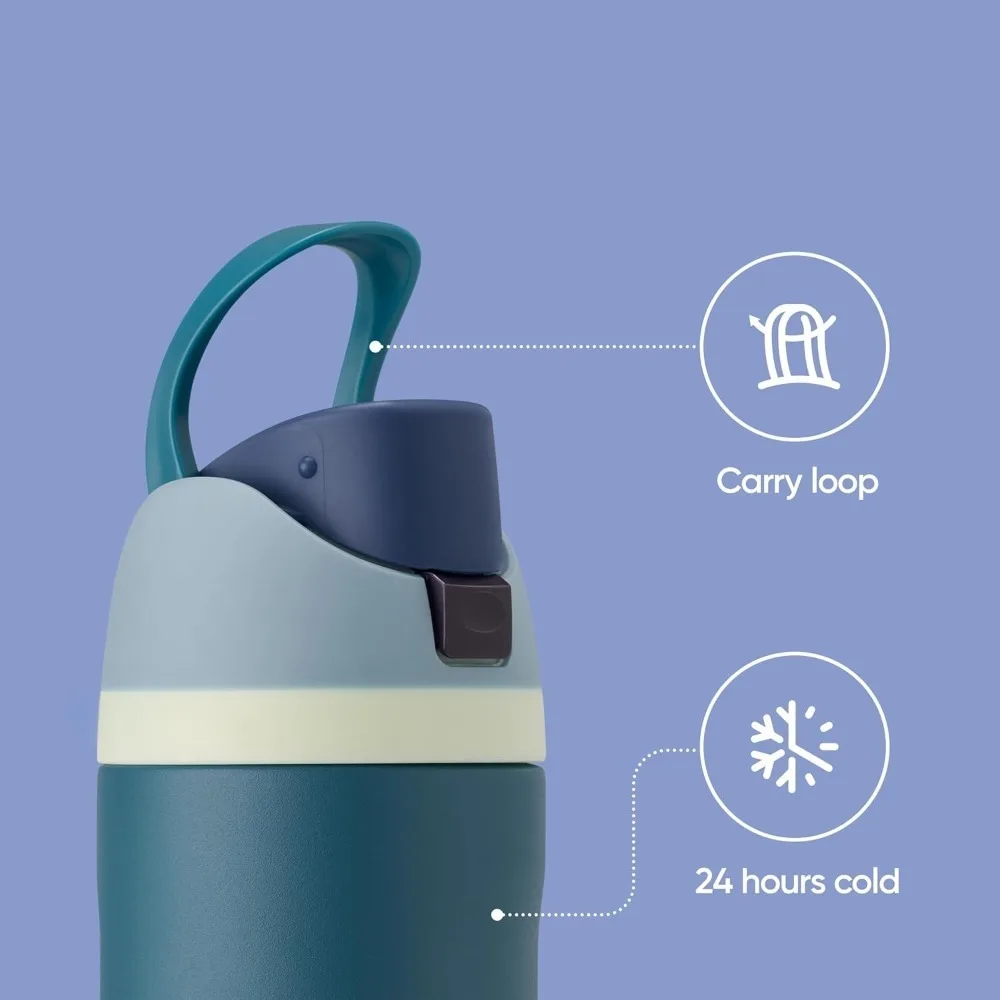 24-ounce stainless steel insulated water bottle with a spout and locking lid. Drink from the built-in straw upright or tilt back to drink from the spout opening. A snap-on protective lid keeps the spout clean; the convenient carrying handle doubles as a carabiner. Double-wall insulation keeps drinks cold for up to 12 hours; the wide mouth allows for easy cleaning and adding ice; and the base accommodates a cup holder. Free of BPA, lead, and phthalates; the bottle is hand washable and the lid is dishwasher safe.